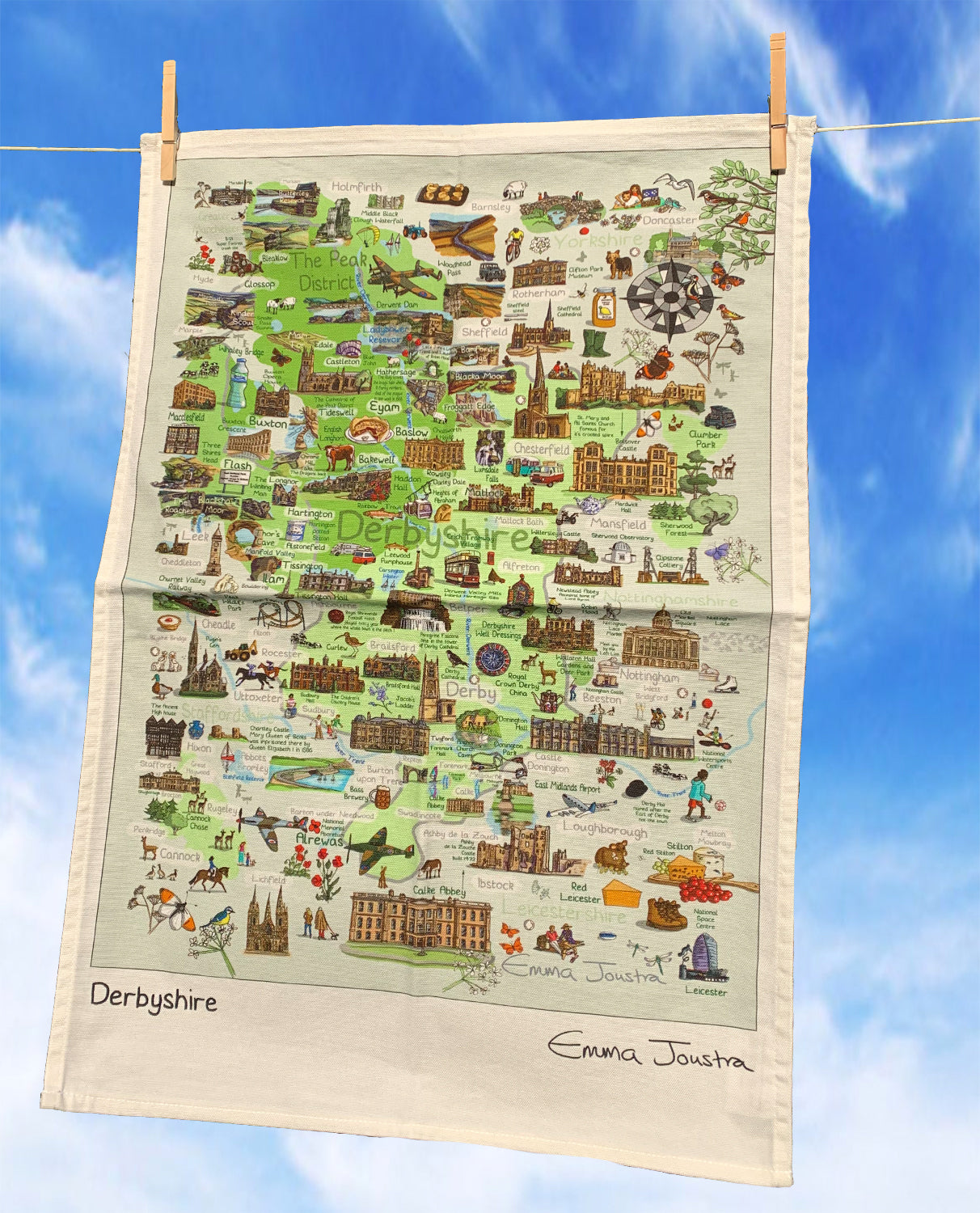 Vibrant cotton tea towel with Emma's fun, colourful illustrations of Derbyshire featuring iconic landmarks, walks and waterfalls.