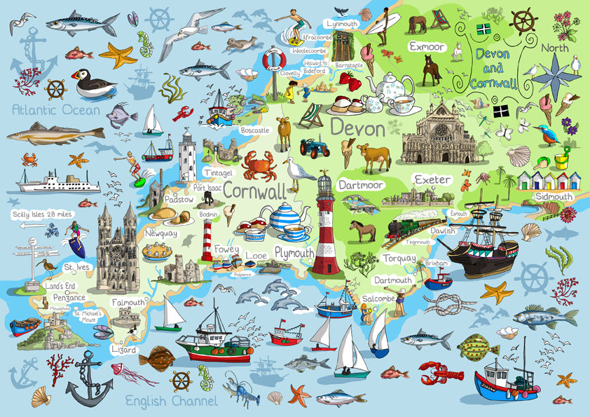 A bright and sunny illustration of Devon and Cornwall featuring popular seaside towns and landmarks